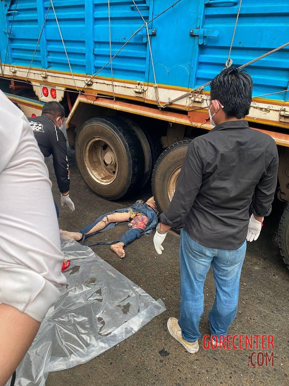 PHNOM PENH, CAMBODIA – OCTOBER 10, 2025 Collision between a motorcycle and a truck occurred in the early morning hours on Veng Sreng Street in the Mean Chey district. Unfortunately, the accident claimed the lives of two young men – the motorcycle driver and his passenger. One of them suffered a serious head injury and died before the emergency services arrived. Random bystanders recorded his final moments on video. The other one died on the spot under the wheels of the truck.