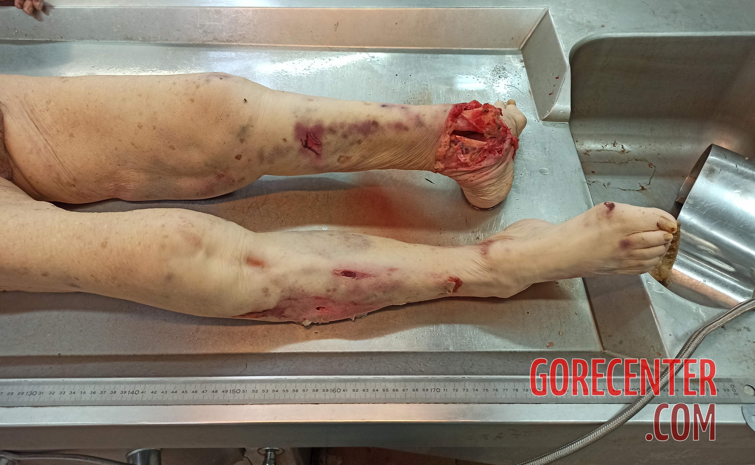 Elderly woman was transported to a funeral home with an open ankle fracture, which ultimately proved fatal. She caused the injury after a fall down the stairs, where due to her injury she could not even call for help. She was found some time later lifeless.