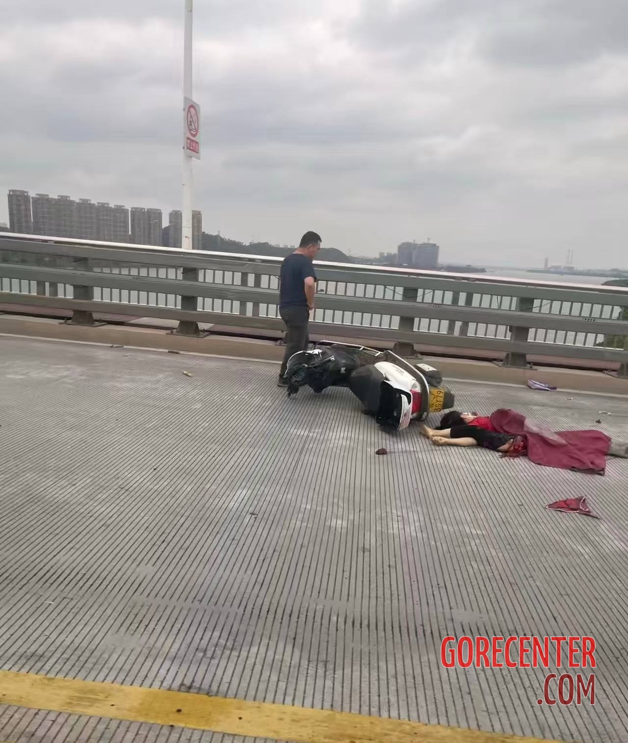 JIANGMEN, GUANGDONG, CHINA – APRIL 6, 2026 Collision occurred on the Chaolian Bridge between a concrete mixer truck and a woman on a scooter. She was run over and dragged several feet under the wheels of the truck. Her body was torn into two halves and her internal organs fell out. She was pronounced dead at the scene.