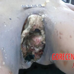 The photos show the corpse of a woman in an advanced stage of decomposition. Her pussy was partially eaten by worms.