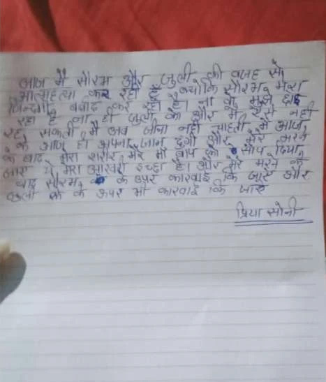 Today I am committing suicide because of Saurabh and Julie, because Saurabh is ruining my life. Neither is he leaving me nor Julie. I can’t live like this. I don’t want to live at all anymore. I will give up my life today and after my death, my body should be handed over to my parents. This is my last wish. After my death, action should be taken against Saurabh and Julie