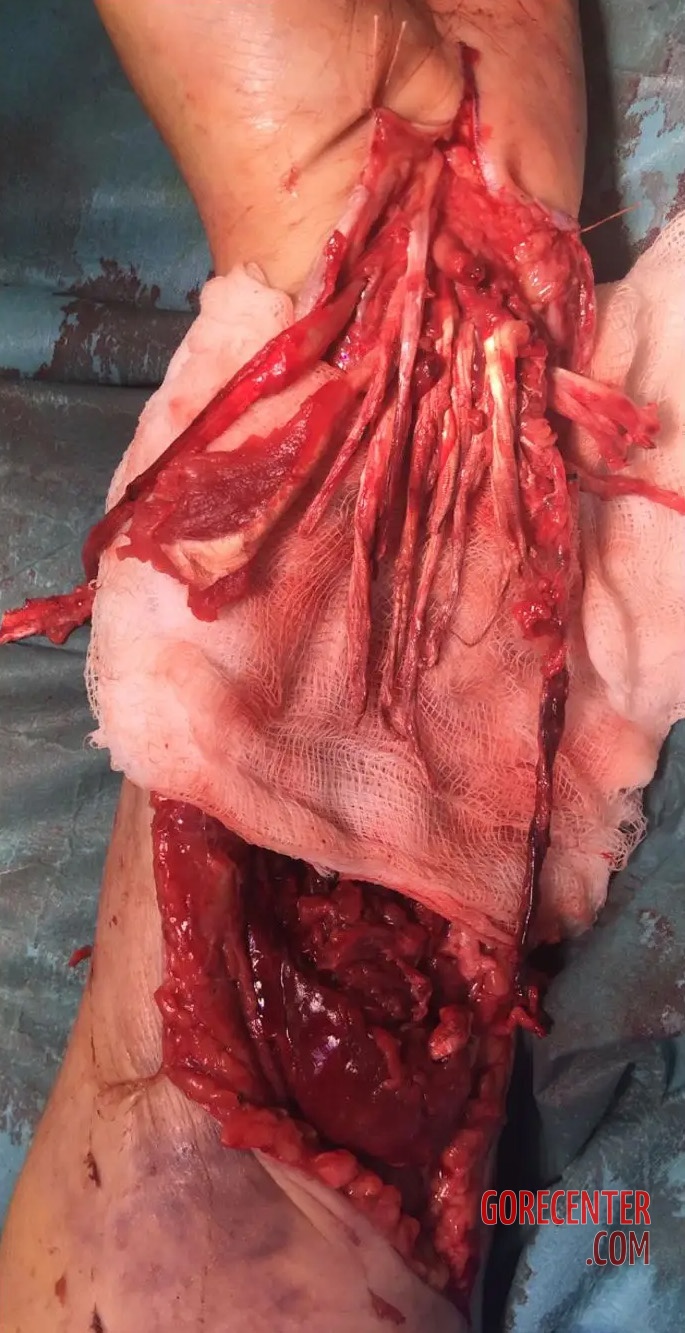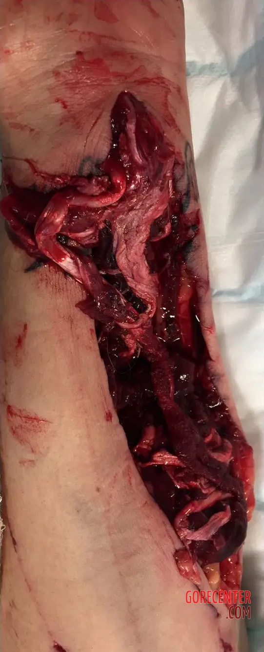 40-year-old woman was admitted to the hospital’s emergency department with severe injuries to both of her wrists and active bleeding. At the time of admission, it was estimated that she had lost over 25 oz (750 ml) of blood, corresponding to approximately 15–17% of her total blood volume.