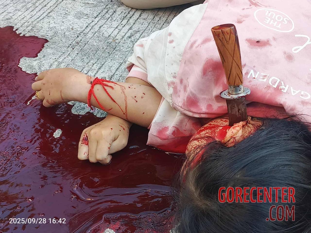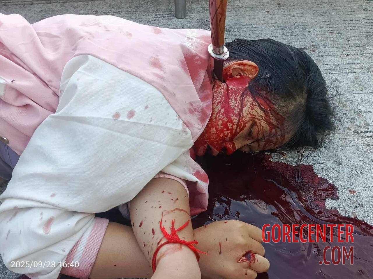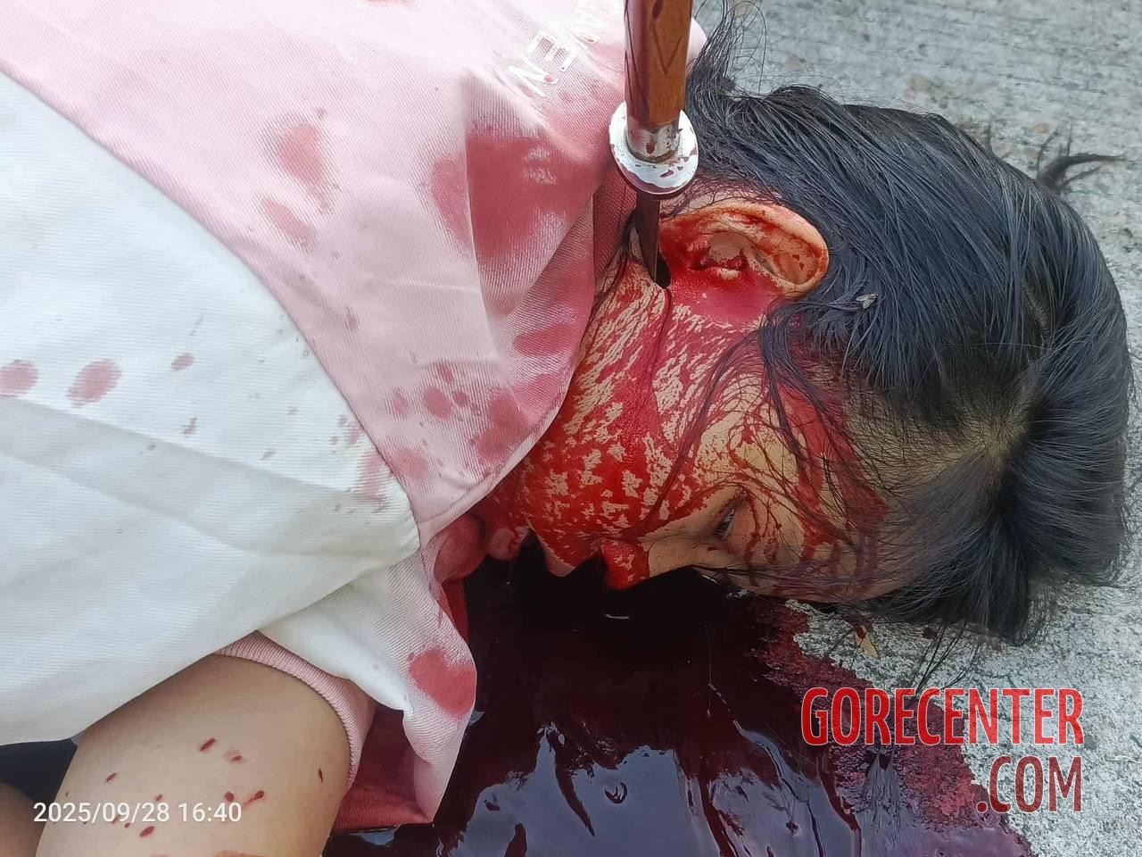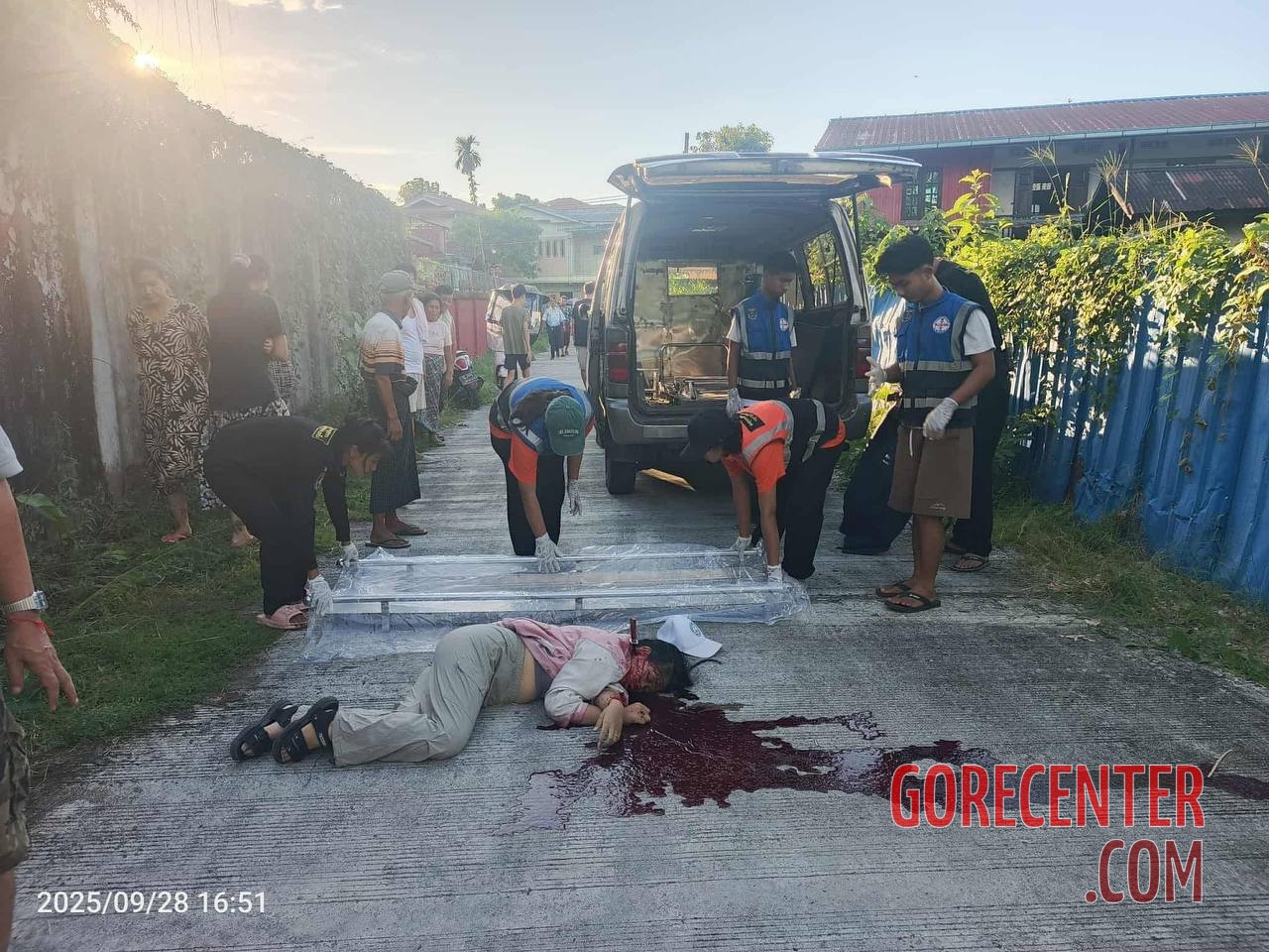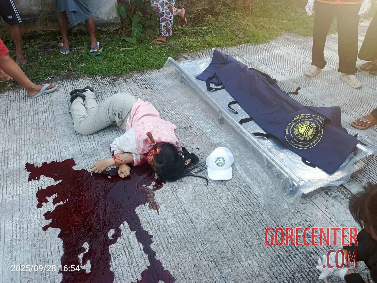 MYITKYINA, KACHIN STATE, MYANMAR (BURMA) – SEPTEMBER 28, 2025 Woman’s body was found lying on a road near a Buddhist temple in a pool of her own blood. A knife was deeply embedded in her neck, near the salivary gland. Authorities are still investigating, including identifying the victim, the perpetrator, and the motive for the murder.